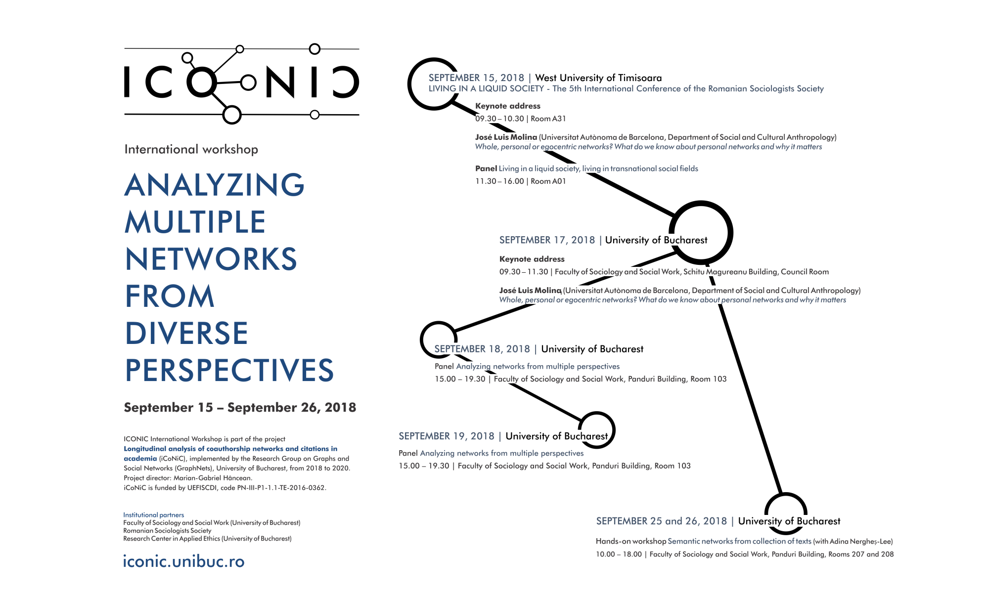 The first ICONIC international workshop Analyzing multiple networks from diverse perspectives will take place from September 15 to 26, 2018, actually representing a series of lectures, seminars, roundtables and a hands-on workshop meant to cover many different uses and practices of social network analysis. This omnibus workshop is the first of such scale in Romania, taking place in two cities – Timisoara and Bucharest –, for six days, and approaching numerous topics, like personal networks, transnational (migrant) networks, coauthorship networks in science and semantic networks. It has also a multidisciplinary purpose, bringing together social sciences, computer and data science, linguistics and digital humanities, and ethics.